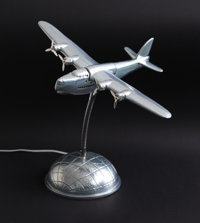 Tolle und sehr rare vintage Aluminium-Tischlampe im Art Deco Stil in Form eines Boeing 314 Clipper Flugzeugs. Das Flugzeug ist mittels schwankbarem Schwanenhals an einer schweren Aluminium Weltkugel befestigt. Es kann von innen beleuchtet werden. Die Lampe funktioniert einwandfrei und befindet sich in einem tadellosen Zustand. Die Pan American Clipper war von 1931 - 1946 im Einsatz mit den Flugzielen Philippinen, Hawaii und Karibik. Während des zweiten Weltkriegs wurde sie in den Kriegsdienst gestellt und transportierte Truppen und Ausrüstung an die pazifischen Fronten.